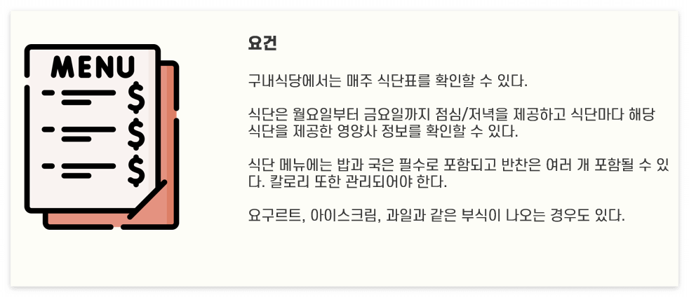 데이터 모델링에서는 정규화가 되어있지 않다고 말하는데요. 현재 테이블 구조에서 아침에도 식단을 제공한다! 라는 요건이 추가 되면 비슷한 속성이 9개나 추가되어야 해요. 여기서 이미 유연성/확장성이 떨어지는것을 볼 수 있습니다.
