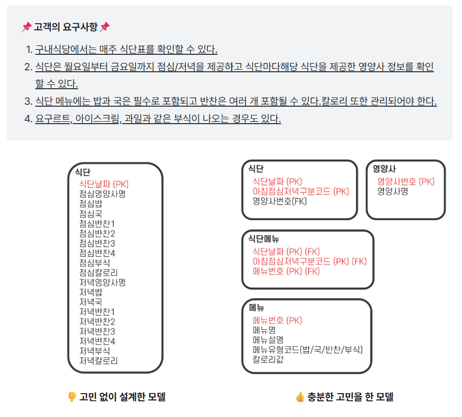 구내식당의 식단을 관리하는 데이터 모델에 대한 내용도 나와있습니다.