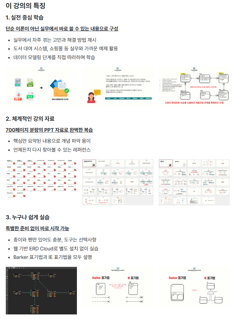 강의를 모두 수강하시면 데이터 모델링(테이블 설계)에 대해 가졌던 궁금증들이 자연스럽게 해소되실 거예요.